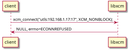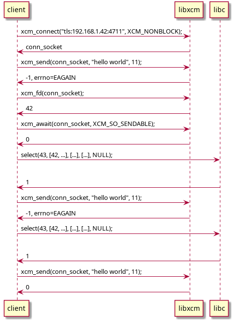 In this example, the application connects and tries to send a message, before knowing if the connection is actually established. This may fail (for example, in case TCP and/or TLS-level connection establishment has not yet been completed), in which case the application will fall back and wait with the use of xcm_await(), xcm_fd() and select().