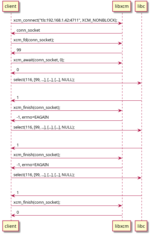 After waking up from a select() call, where a particular XCM non-blocking socket's fd is marked readable, the application must, if no xcm_send(), xcm_receive() or xcm_accept() calls are to be made, call xcm_finish(). This is to allow the socket to finish any outstanding tasks, even in the case the application has no immediate plans for the socket.